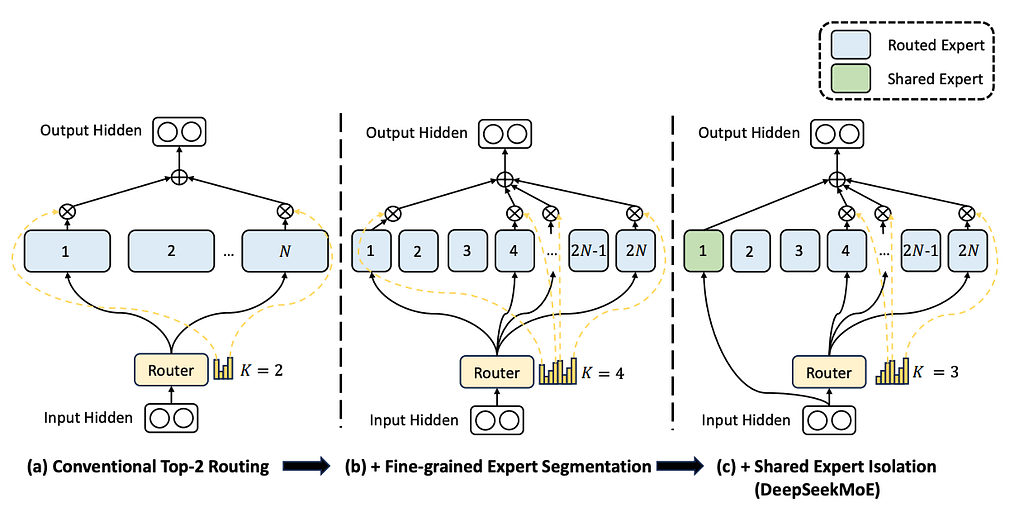 Here, ‘k’ experts are fixed, in the sense that they always run for every prediction. This ‘shared expert’ or experts capture the broad knowledge, while the hyperspecialized experts, which can reach up to 64 for this particular model, capture more fine-grained knowledge.
