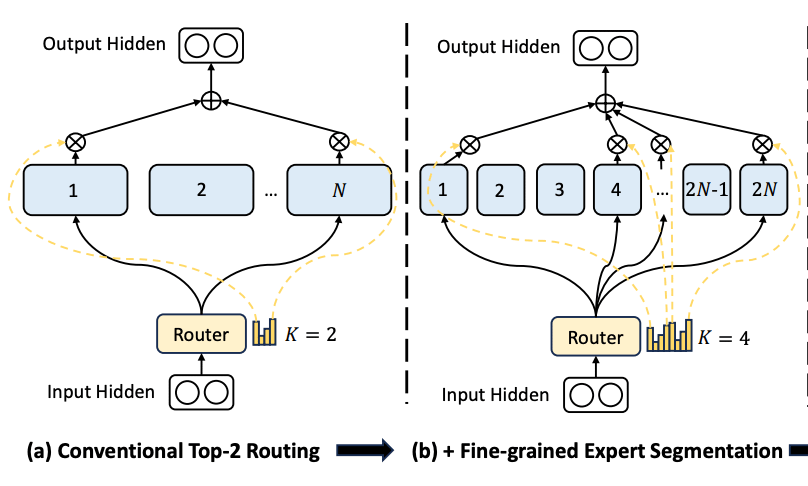 This way, you ‘fight off’, or at least minimize, the aforementioned issues of standard MoEs, knowledge is less redundant as experts are much more specialized, while the ‘broader’ data is captured by the shared experts.