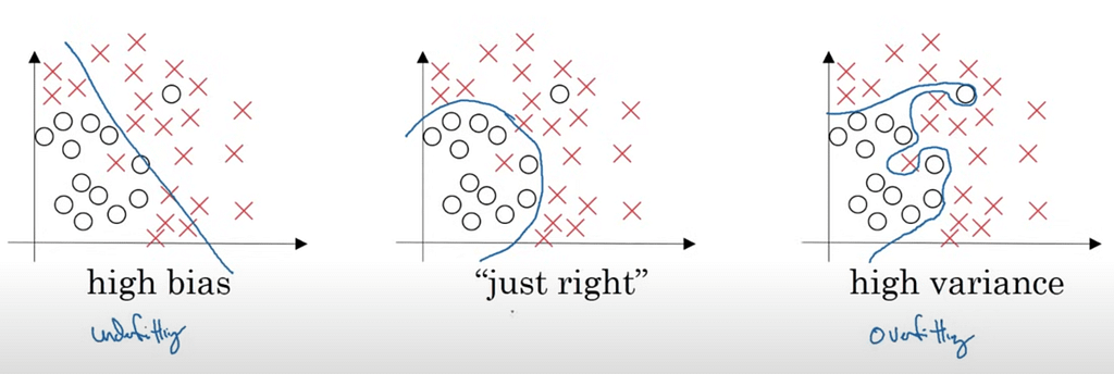 The one in the middle finds the sweet spot, as even though it will have some mistakes (like the circle that is on the wrong side of the border) the model has still realized that data points close to the bottom-left side of the graph are usually circles (which is palpably true and it’s a good pattern to learn).
