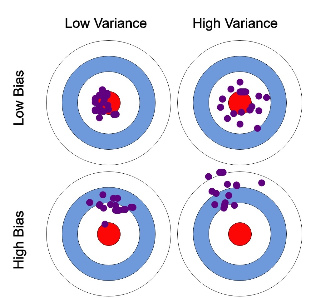 If your model has high variance with low bias, the model will tend to approach the correct answer (illustrated as the red circle in the middle) but very slight changes to the body mechanics of the archer cause massive drifts in the result. This means that the model is extremely sensitive to input changes, as it has basically memorized the training data to the point that anything that doesn’t resemble almost perfectly the training data is considered ‘unknown’.