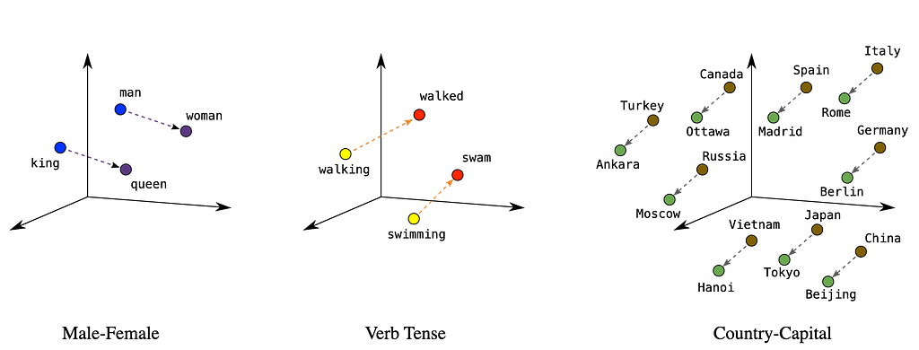 For example, one of the most visual examples was the aforementioned equation, whereby subtracting Man’s vector from King’s vector and adding the Woman’s vector, the resulting vector was none other than ‘Queen’, which meant that, indeed, the numbers in the vectors carried out the meaning of the underlying concept.